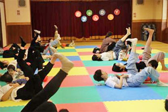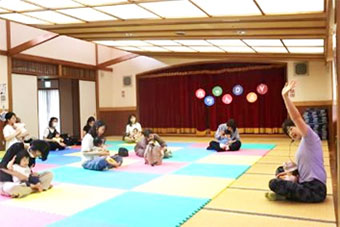 講師にインストラクターの三船美也子さんをお招きし、お母さんがリラックスできるような肩や腰のストレッチ、ミニバランスボールを使ったエクササイズをご指導いただきました。