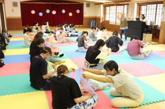 膝にのせて歌やピアノ、打楽器に合わせて体をゆらしたり、赤ちゃんを寝かせてスキンシップをとりながら歌ったり、赤ちゃんとお母さんの笑顔がたくさん見られる講座でした。音楽に合わせて赤ちゃんを抱っこして歩き回り、お母さん同士で挨拶しあうことで、お母さん同士のコミュニケーションにもなりました。