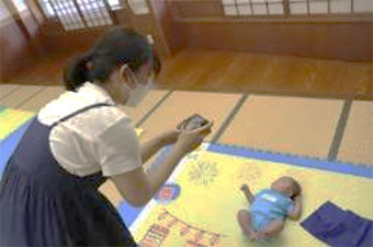 また、赤ちゃんはビニール袋とシールで作った「おばけ」が曲にあわせて動く様子を見たり、講師お手製のマラカスで音を楽しんだりと、豊かな感性を育むきっかけになる30分だったと思います。