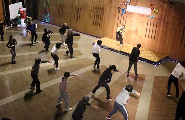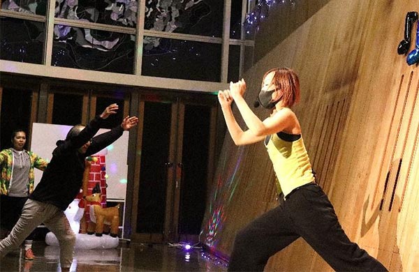夜の開催ということで、イルミネーションやミラーボールなどで会場を飾りいつもと違った雰囲気の中でエアロビクスを楽しみました。クリスマスのポップなノリのよい音楽が流れ、講師の蛯沢さんの掛け声に合わせ、楽しく汗を流しました。初級はゆっくりなテンポで初心者でも分かり易く、中級は複雑な動きも増え、より運動量があがる内容でした。
